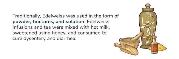 The oldest use of Edelweiss is associated with rheumatic pains. It was also a popular domestic remedy for treating diarrhea and stomach pains in Europe.